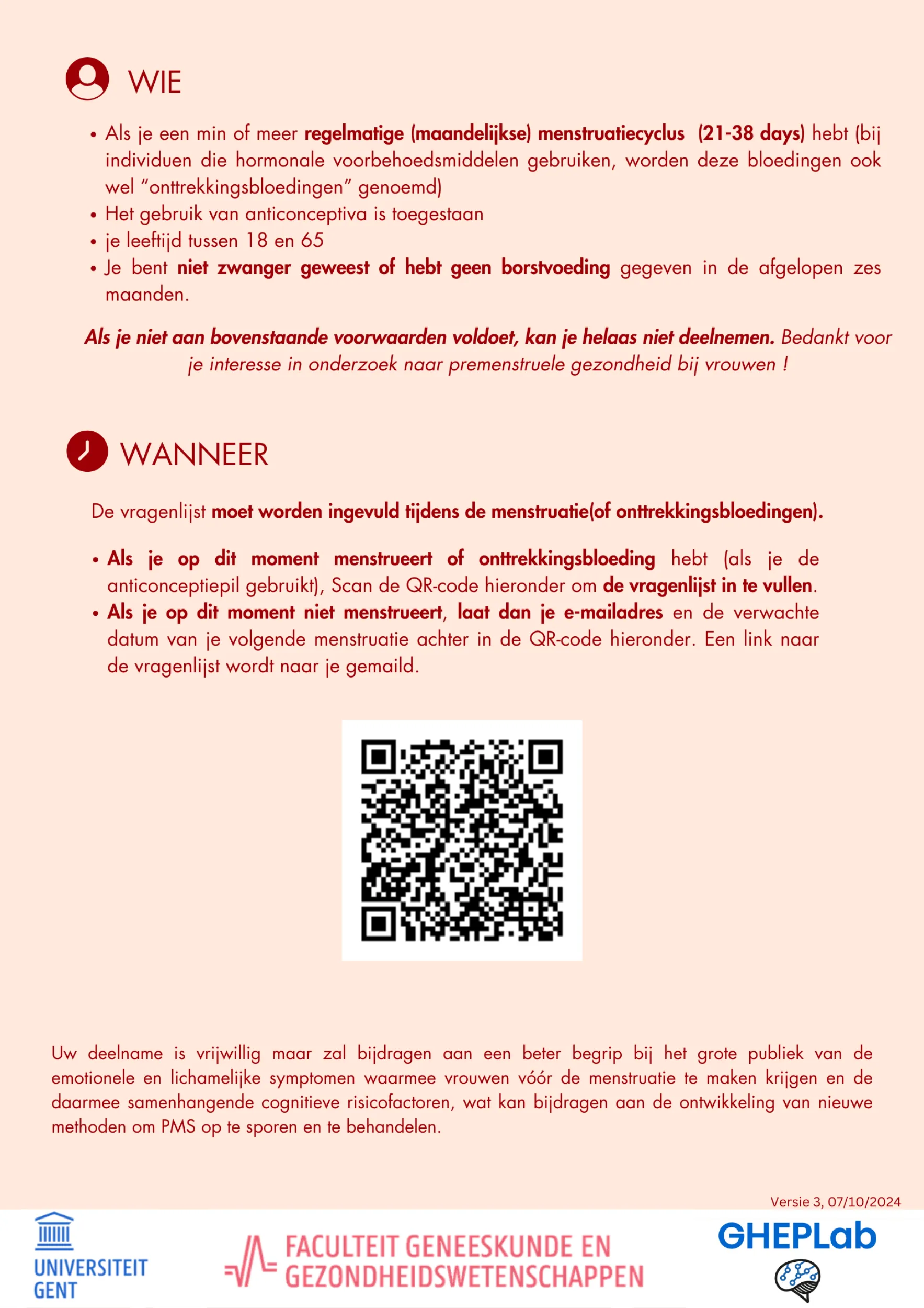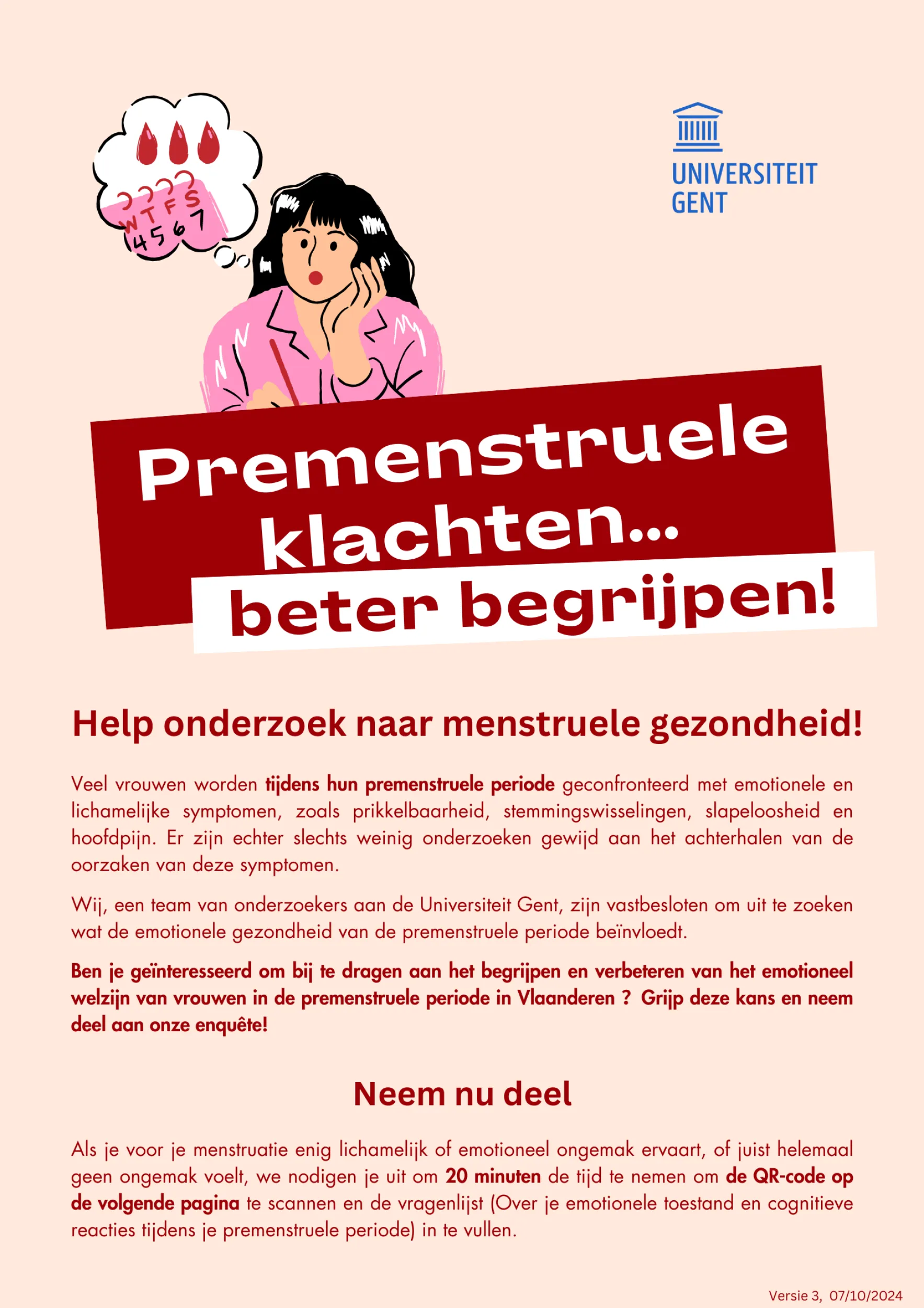 Ongeacht of u geen, milde, matige of zelfs storende premenstruele klachten ervaart, nodigen wij u vriendelijk uit om uw ervaringen met ons te delen. Dit zal ons helpen een beter inzicht te krijgen in de psychologische en cognitieve factoren die verband houden met premenstruele klachten. Hiertoe nodigen wij u uit om een beknopte online vragenlijst in te vullen (+-20 minuten). Uw ervaringen zullen ons helpen om de oorzaken van premenstruele klachten beter te begrijpen en om de diagnostiek en interventiemethoden verder te verbeteren.